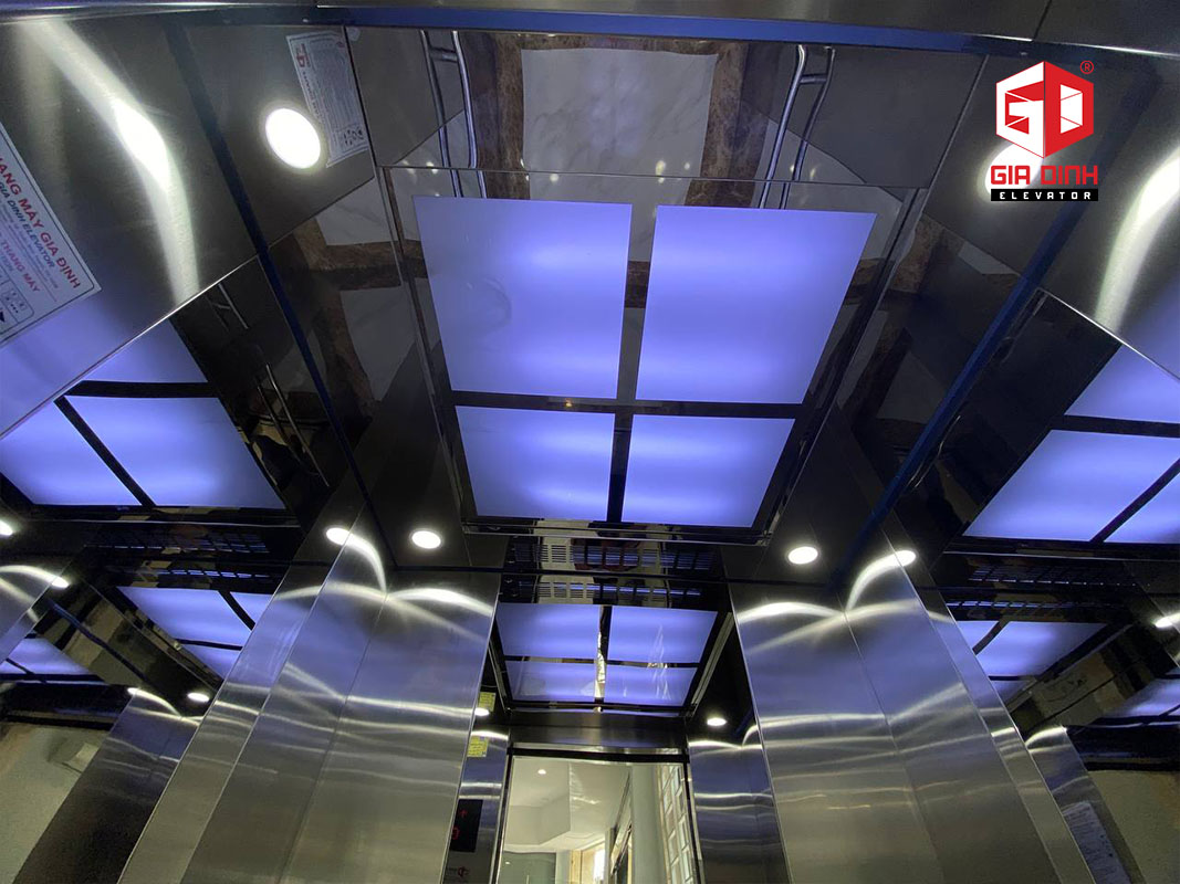 Cabin bên trong được hoàn thiện bằng inox gương sáng bóng, kết hợp với trần thang trang trí đèn LED ánh sáng dịu nhẹ, tạo cảm giác rộng rãi và hiện đại. Sàn cabin lát đá hoa cương trắng viền nâu sang trọng, vừa đảm bảo độ bền, vừa tăng tính thẩm mỹ. Hệ thống cửa tự động vận hành êm ái, cùng bảng điều khiển tối giản, dễ sử dụng, phù hợp hoàn hảo cho các căn nhà phố, biệt thự hiện đại.