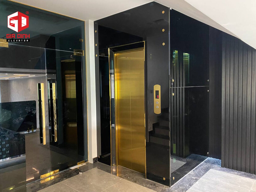 Thang máy Quận 12 – TPHCM Thang máy kính đen cửa inox vàng sang trọng Mẫu thang máy gia đình